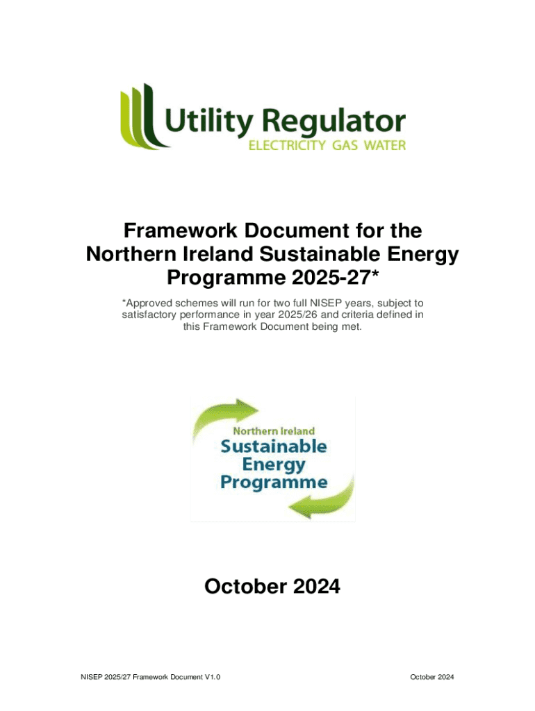 This Framework Document outlines the rules and procedures for organizations participating in the Northern Ireland Sustainable Energy Programme (NISEP) for the years 2025-27. It details the eligible