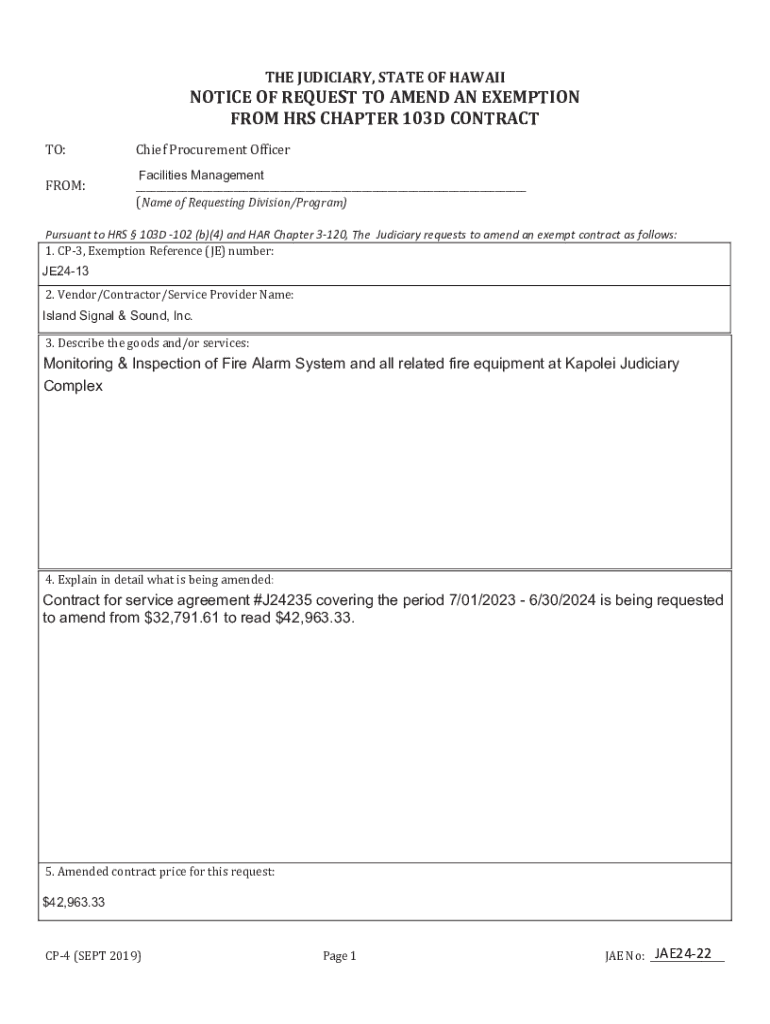 This document is a formal request from The Judiciary of Hawaii to amend an existing exempt contract pertaining to monitoring and inspection services for the fire alarm system at the Kapolei Judiciary
