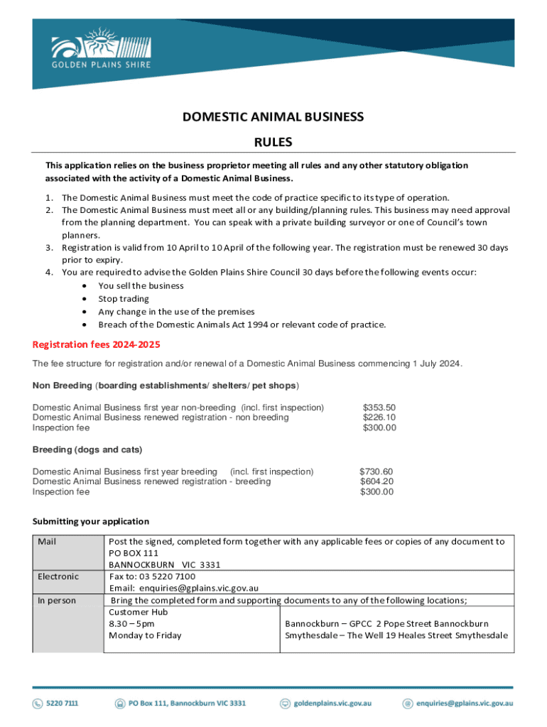 This document outlines the rules, regulations, and application process for registering a Domestic Animal Business, including requirements for business operators, registration fees for different types