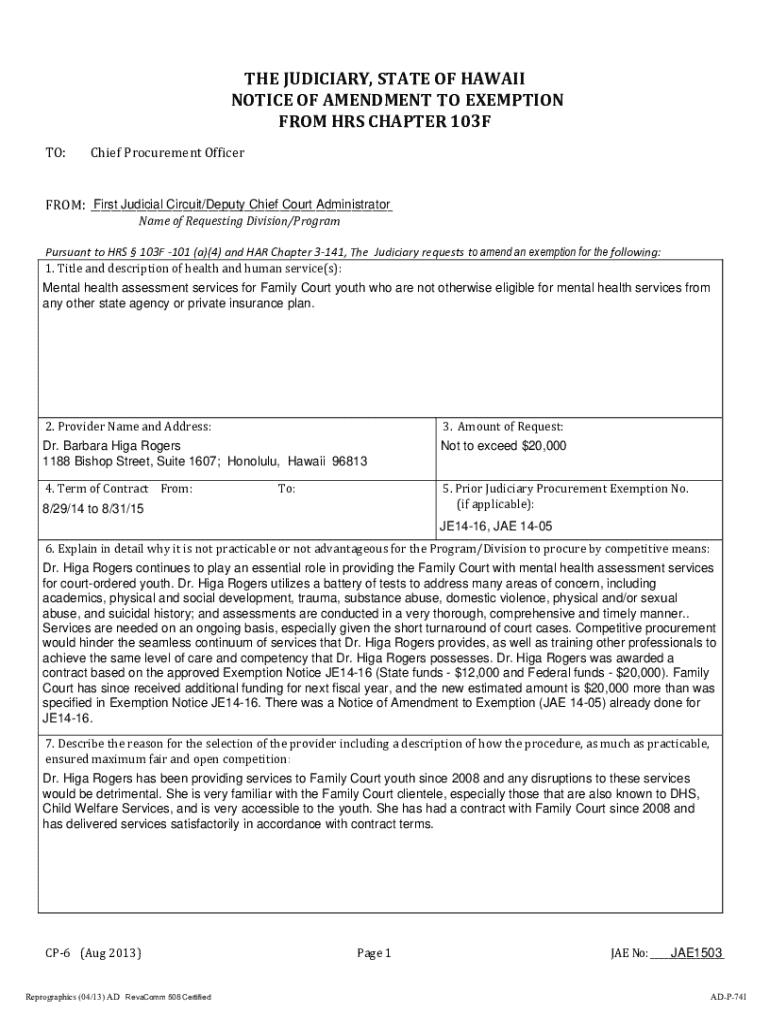 THEJUDICIARY,STATEOFHAWAII NOTICEOFAMENDMENT TO EXEMPTION FROMHRSCHAPTER103F TO:ChiefProcurementOfficerFirst Judicial Circuit/Deputy Chief Court Administrator FROM: ___NameofRequestingDivision/Program