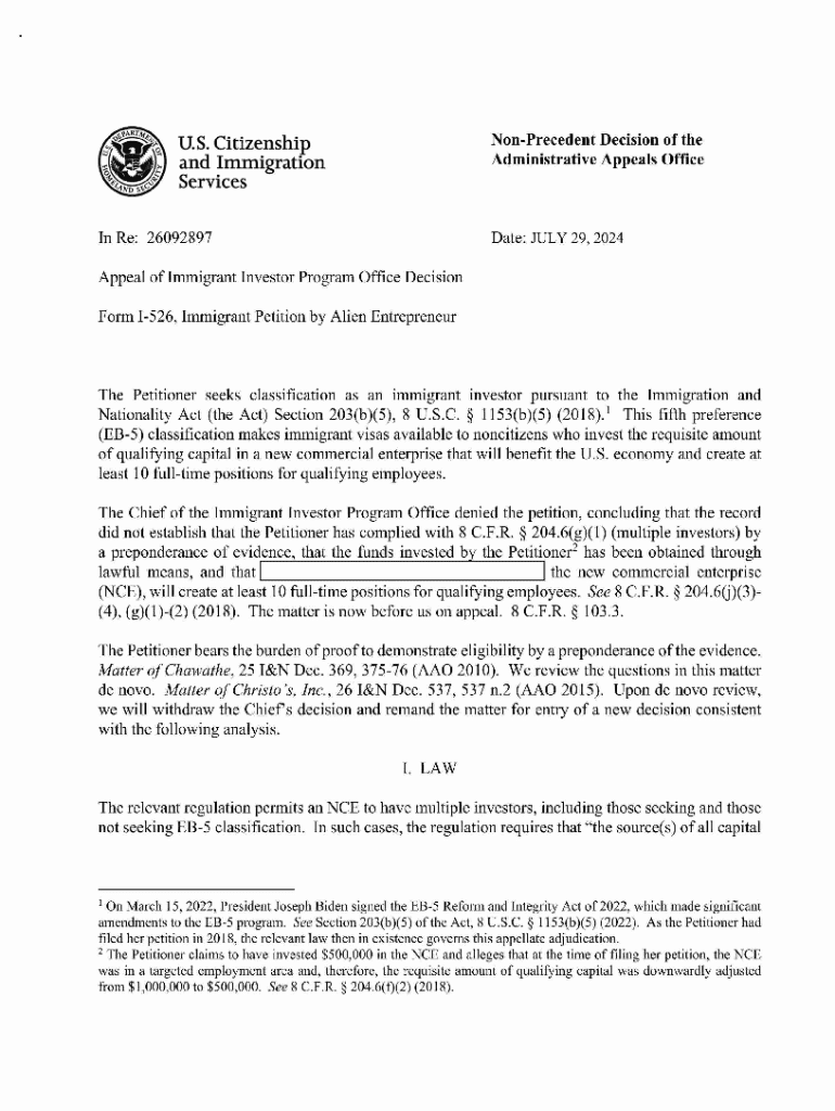 This document addresses the appeal of a denial to classify the petitioner as an immigrant investor under the EB-5 program. It discusses the requirements for investment amount, job creation, and legal