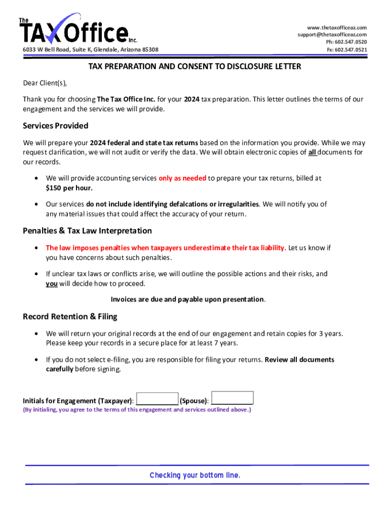This document outlines the terms of engagement and services provided by The Tax Office Inc. for tax preparation for the year 2024, including penalties, record retention, and consent for disclosure