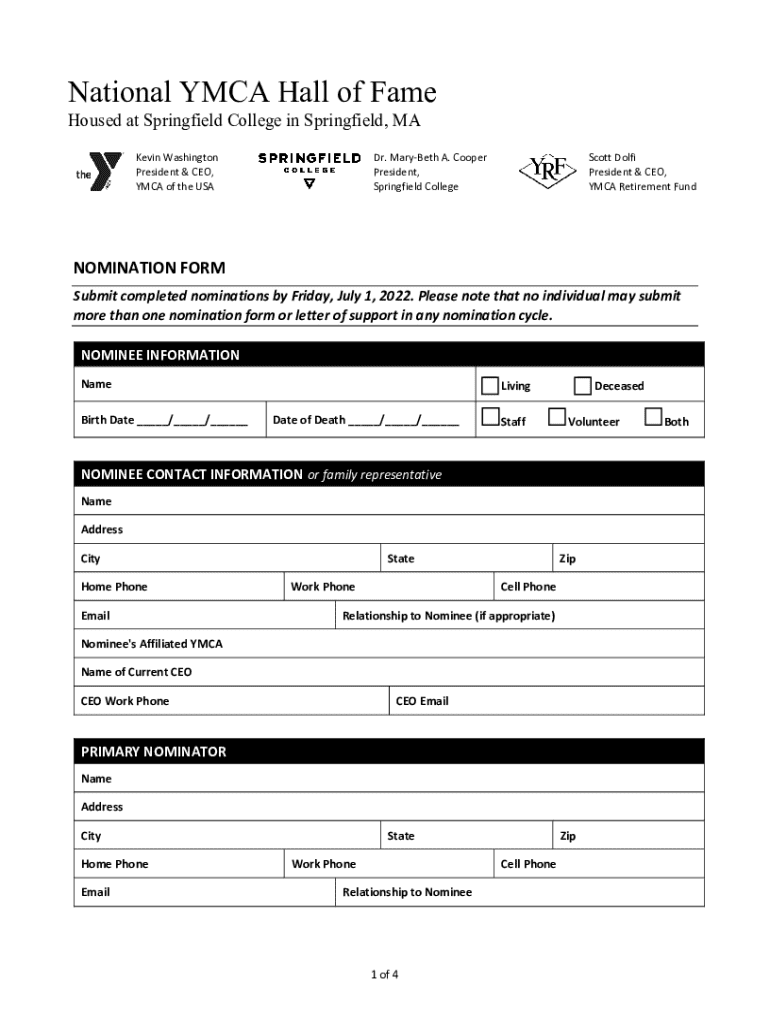 Este formulario de nominación está diseñado para presentar candidatos para el Salón de la Fama de YMCA, reconociendo a aquellos que han tenido un impacto significativo en el movimiento YMCA, ya