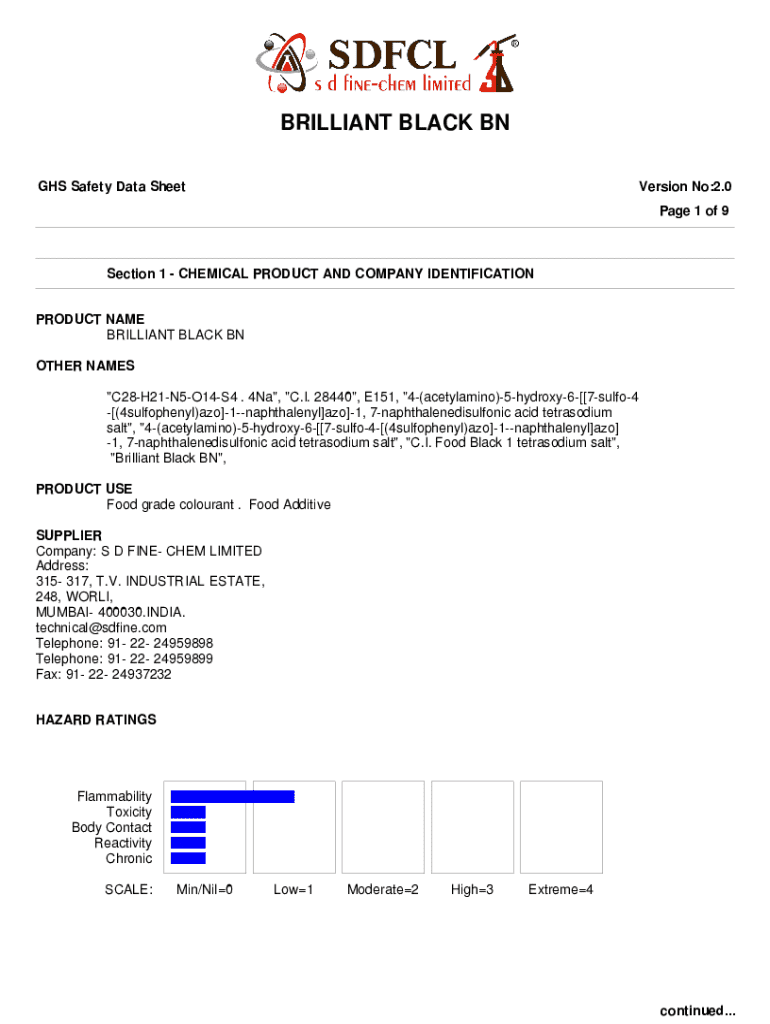 Safety Data Sheet for Brilliant Black BN, a food grade colorant, detailing product identification, hazard information, first aid measures, firefighting measures, accidental release measures, handling