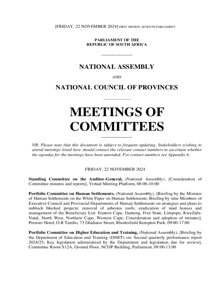 [FRIDAY, 22 NOVEMBER 2024] FIRST SESSION, SEVENTH PARLIAMENT PARLIAMENT OF THE REPUBLIC OF SOUTH AFRICA ___NATIONAL ASSEMBLY ANDNATIONAL COUNCIL OF PROVINCES ___MEETINGS OF COMMITTEES ___NB: Please