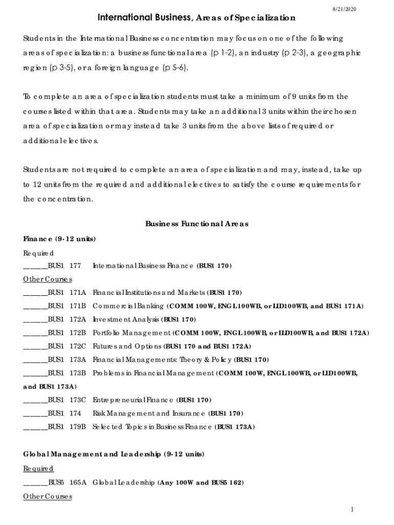 International Business, Areas of Specialization8/21/2020Students in the International Business concentration may focus on one of the following areas of specialization: a business functional area (p