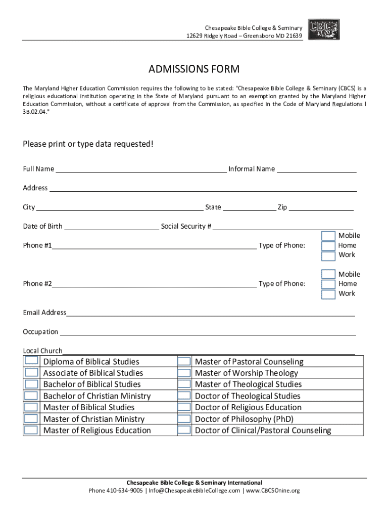 This document serves as the student admissions form for Chesapeake Bible College & Seminary, collecting personal information, educational background, and acknowledgment of the institution\'s accreditation