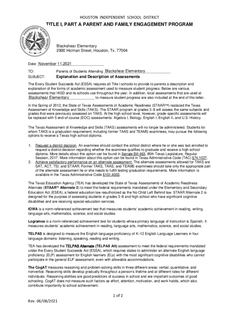 Este documento proporciona una descripción y explicación de las evaluaciones académicas utilizadas para medir el progreso estudiantil en la Escuela Primaria Blackshear, en cumplimiento con la Ley