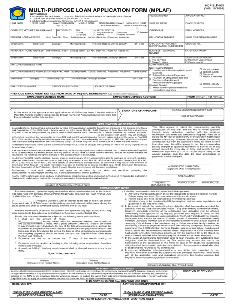 This document is a loan application form for Pag-IBIG Fund members applying for a Multi-Purpose Loan (MPL). It includes various personal and employment details required for the application process,
