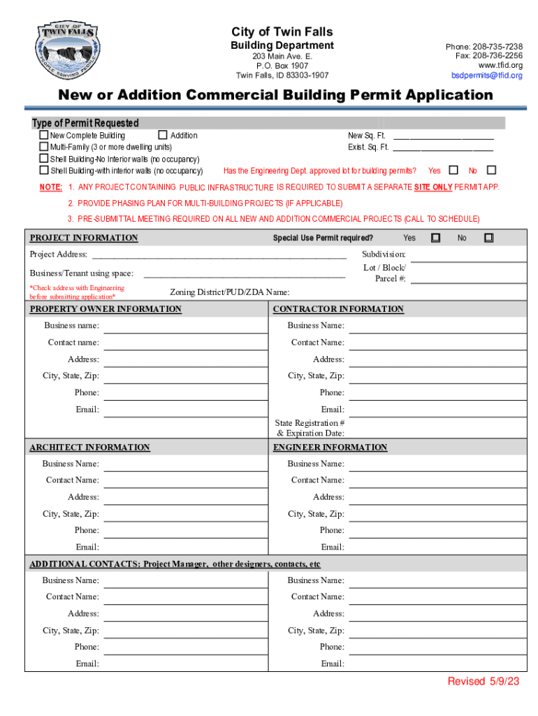 Application form for permits related to new or additional commercial building projects in Twin Falls. Includes sections for project information, property owner and contractor details, as well as requirements