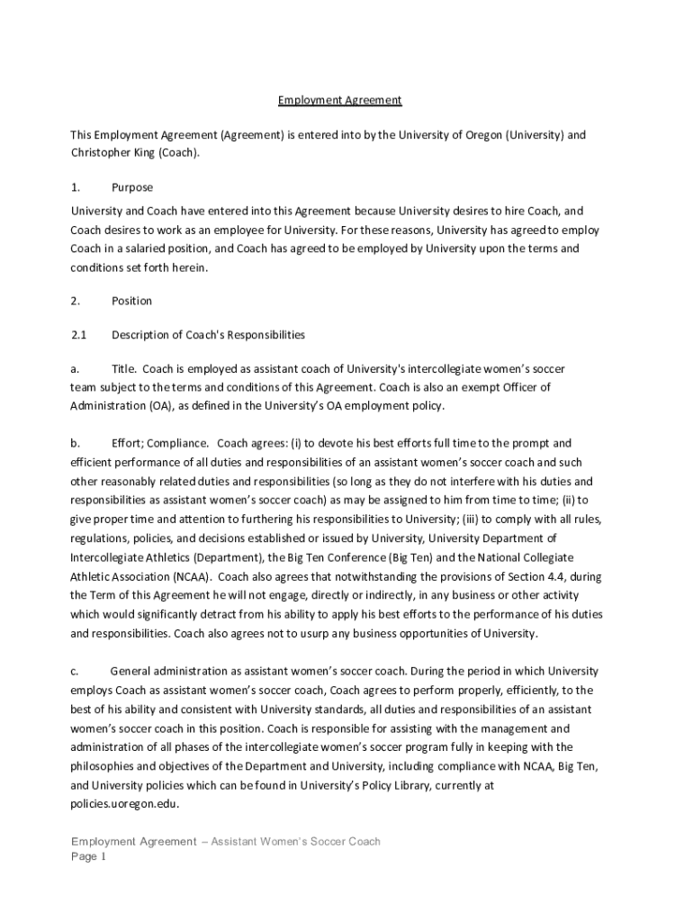This Employment Agreement is between the University of Oregon and Christopher King, outlining the terms and conditions of his employment as the assistant coach for the intercollegiate women’s soccer