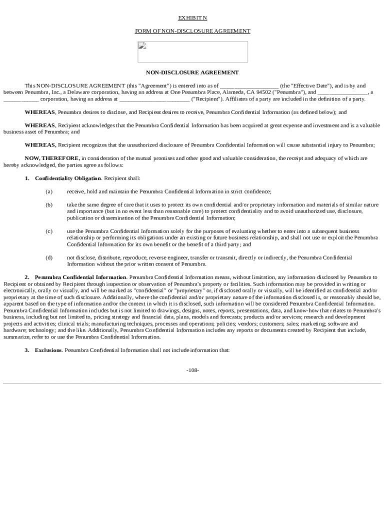 Este Acuerdo de No Divulgación establece las obligaciones de confidencialidad entre Penumbra, Inc. y el destinatario respecto a la información confidencial de Penumbra, que incluye información
