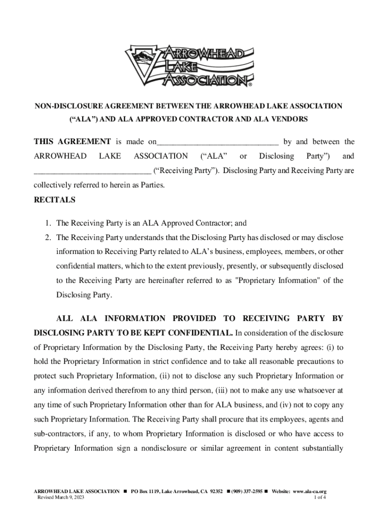 NONDISCLOSURE AGREEMENT BETWEEN THE ARROWHEAD LAKE ASSOCIATION (ALA) AND ALA APPROVED CONTRACTOR AND ALA VENDORSTHIS AGREEMENT is made on___ by and between the ARROWHEADLAKEASSOCIATION(ALAorDisclosingParty)and___