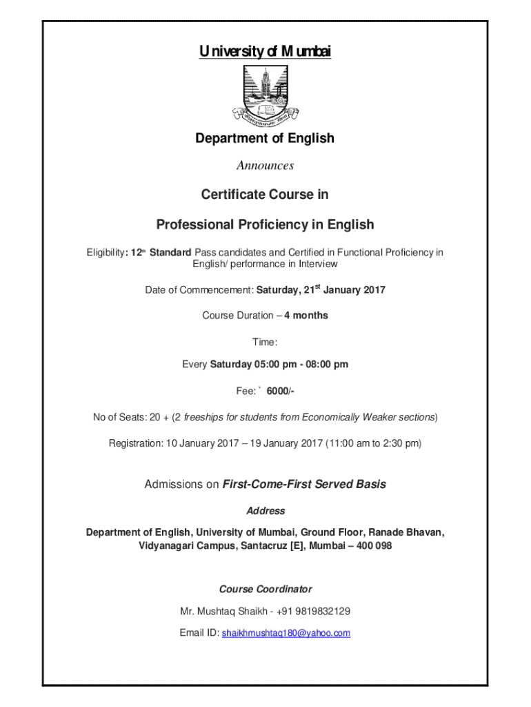 University of MumbaiDepartment of English Announces Certificate Course in Professional Proficiency in English Eligibility: 12th Standard Pass candidates and Certified in Functional Proficiency in