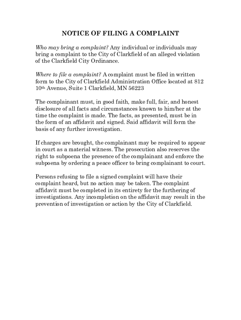 Este documento permite a individuos presentar una queja por una supuesta violación de la ordenanza de la ciudad de Clarkfield, describiendo los pasos a seguir y la necesidad de proporcionar información