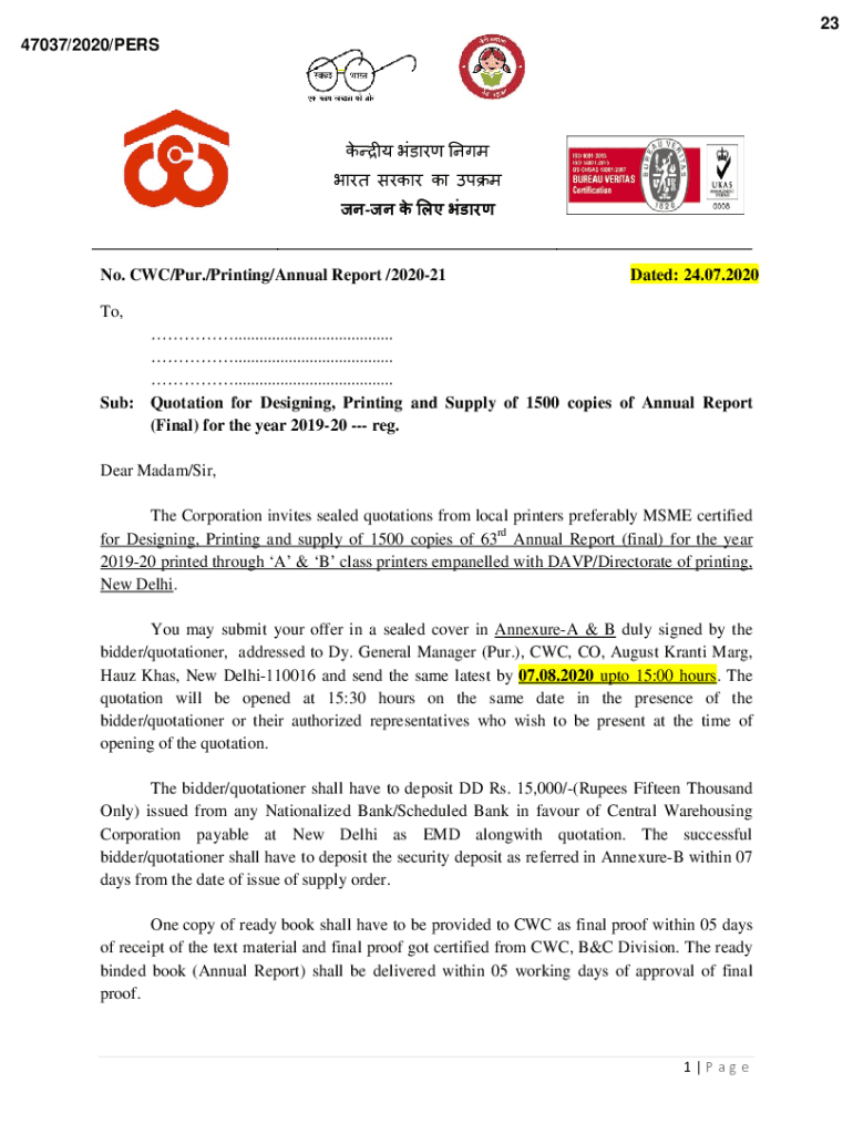 Get the free Quotation for Designing, Printing and Supply of Annual Report