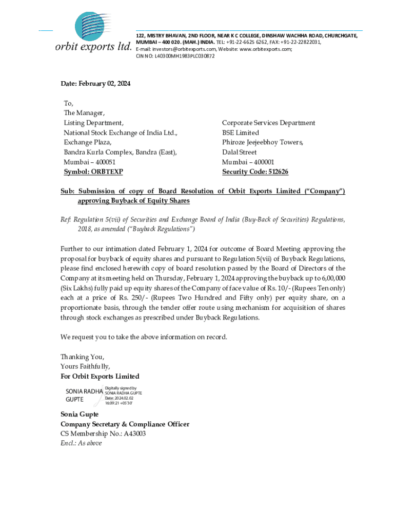 Get the free Sub: Submission of copy of Board Resolution of Orbit Exports Limited (Company)