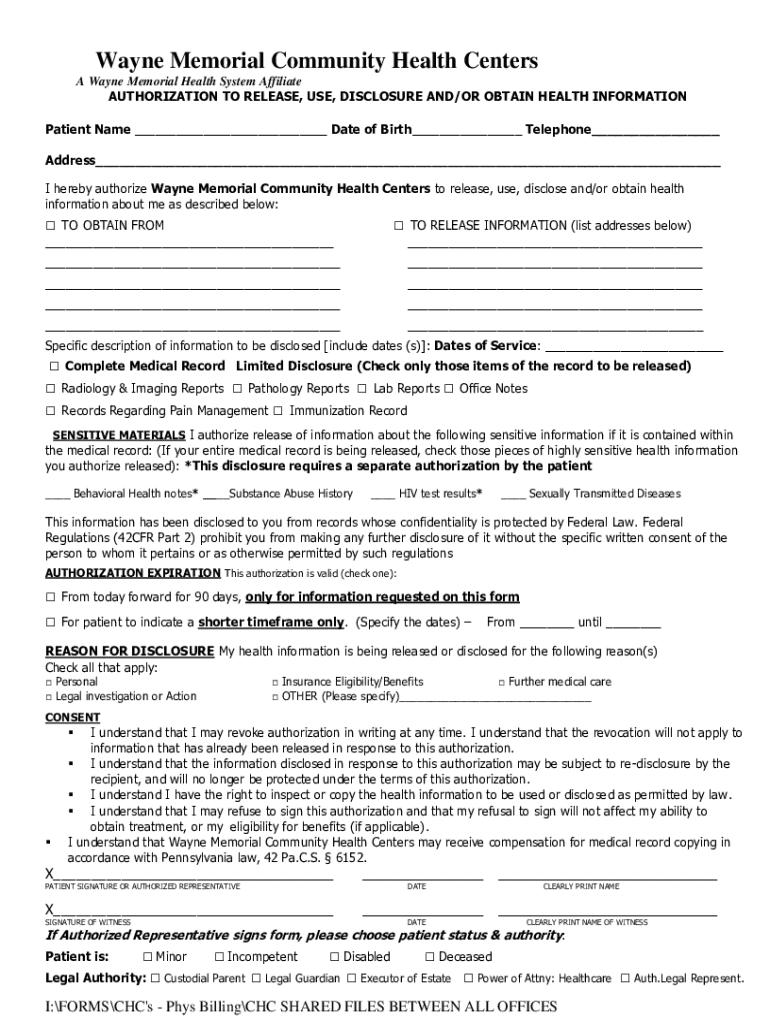 Este formulario permite a Wayne Memorial Community Health Centers autorizar la divulgación y uso de información de salud del paciente. Incluye detalles sobre la información que se puede revelar,