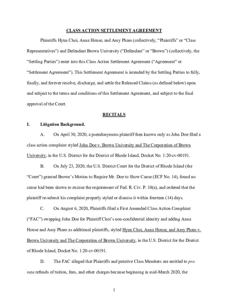 This document outlines the terms and conditions of a settlement agreement between Plaintiffs Hyun Choi, Anna House, Amy Pham, and Defendant Brown University related to a class action lawsuit concerning