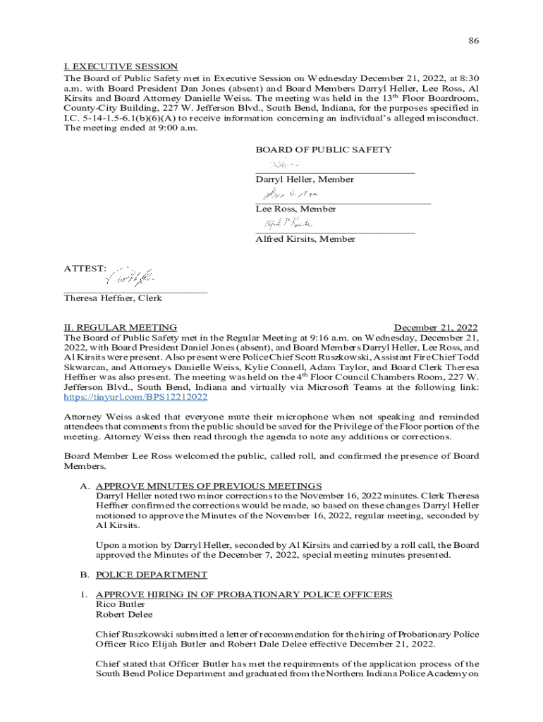 86 I. EXECUTIVE SESSION The Board of Public Safety met in Executive Session on Wednesday December 21, 2022, at 8:30 a.m. with Board President Dan Jones (absent) and Board Members Darryl Heller, Lee