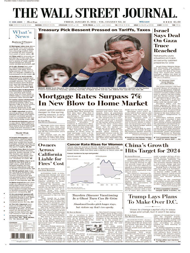 P2JW0170007A0010016DDF61078DFRIDAY, JANUARY 17, 2025 VOL. CCLXXXV NO. 14* * * * * * *DJIA 43153.13 g 68.42 0.16%NASDAQ 19338.29 g 0.9%STOXX 600 520.05 1.0%10YR. TREAS. 12/32 , yield 4.606%WSJ.comOIL
