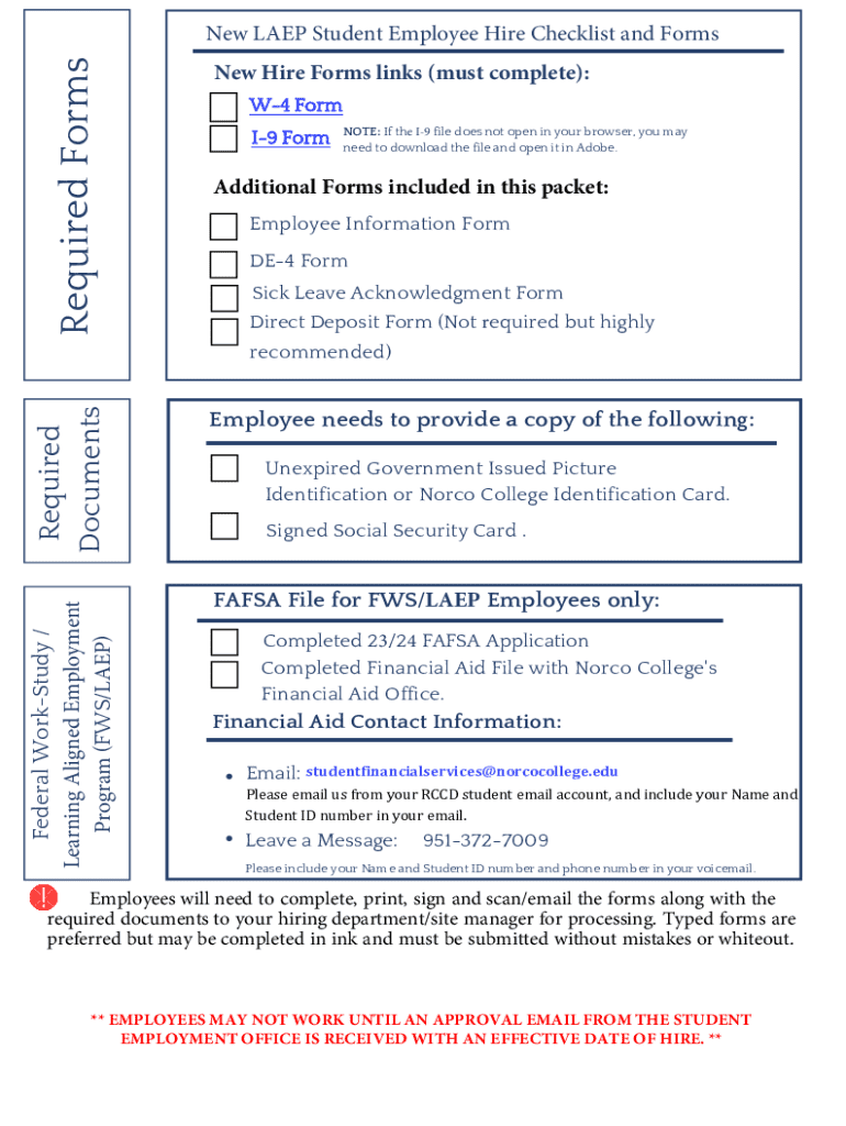 This document outlines the required forms and procedures for new student employees at Norco College, including the W-4 and I-9 forms, employee information, eligibility requirements, and terms and