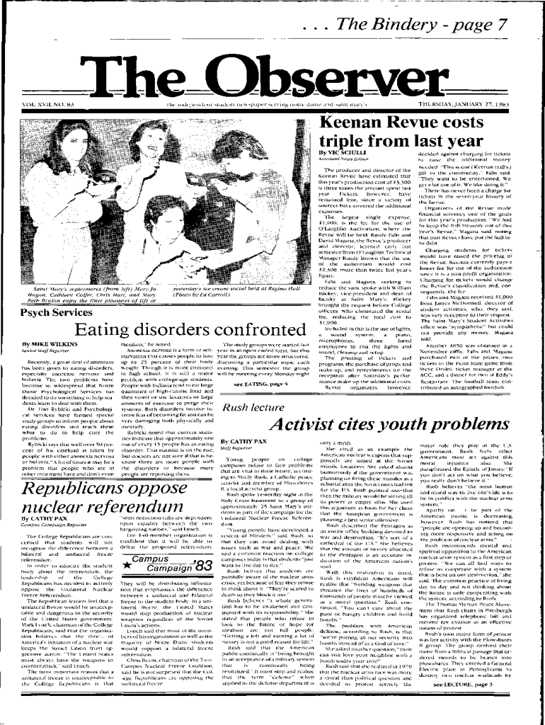 rlw indqKndcnl \'tudnllVOL XVII, NO. H311t\'\'paper\'lTThe Bindery page 7ing notre dame and \'aint man,THURSDAY,JANUARY 27, 1983Keenan Revue costs triple from last year By VIC SCIULLISaint Mal)\'s