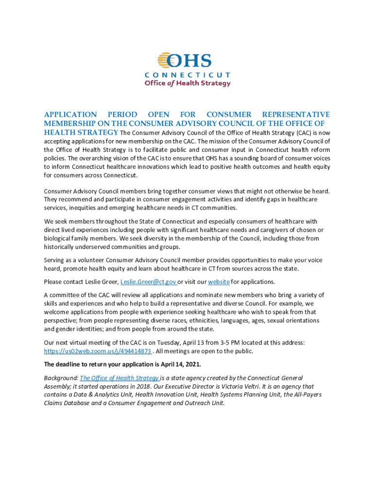 APPLICATION PERIOD OPEN FOR CONSUMER REPRESENTATIVE MEMBERSHIP ON THE CONSUMER ADVISORY COUNCIL OF THE OFFICE OF HEALTH STRATEGY The Consumer Advisory Council of the Office of Health Strategy (CAC)