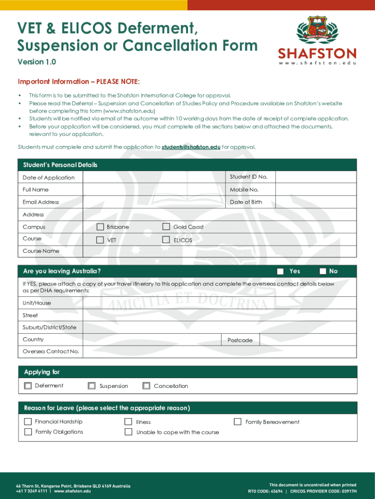 This form is required to be submitted to Shafston International College for the approval of deferment, suspension, or cancellation of studies. Students must complete all sections and attach relevant