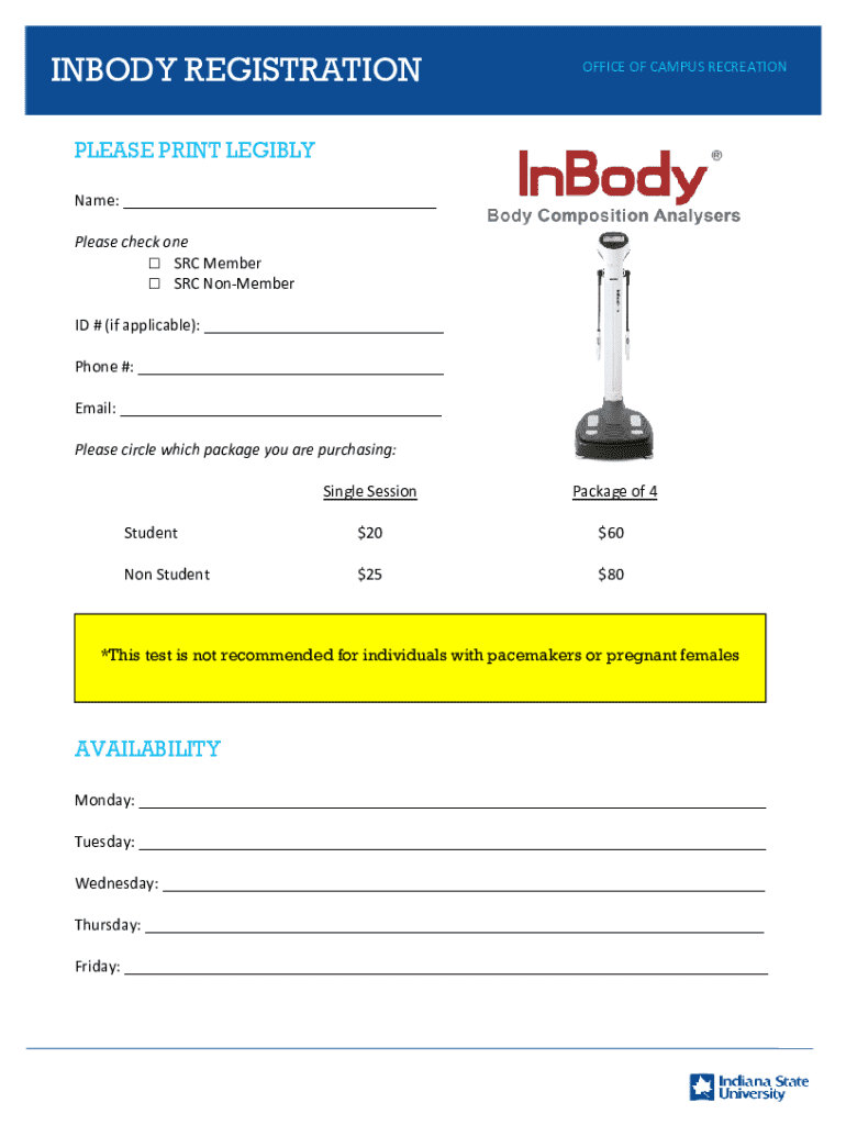 This form is used to register participants for the InBody Test offered by the Office of Campus Recreation. It includes sections for personal information, package selection, and important testing guidelines.