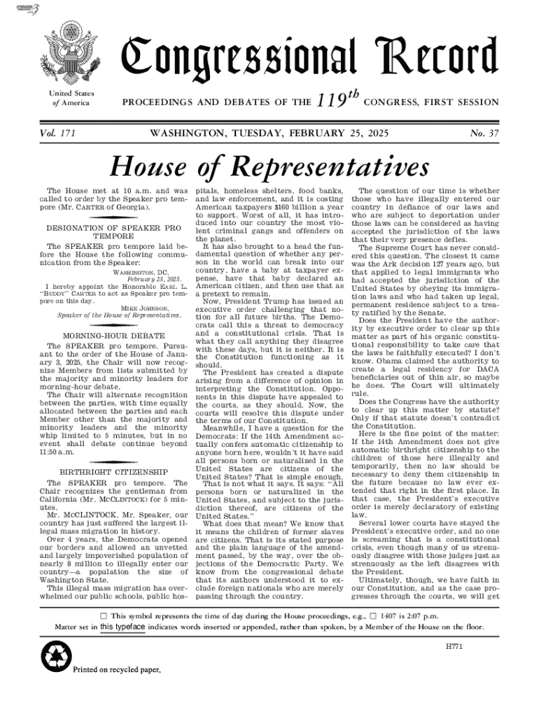 URIB UUE PLNUCongressional RecordMSUnited States of AmericaPROCEEDINGS AND DEBATES OF THEVol. 171119 th CONGRESS, FIRST SESSIONWASHINGTON, TUESDAY, FEBRUARY 25, 2025No. 37House of Representatives