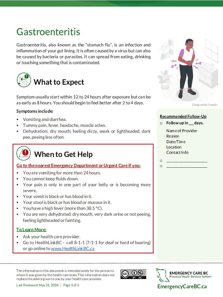 Gastroenteritis discharge instructions are guidelines provided to patients who have been treated for gastroenteritis, outlining care, symptoms to monitor, and recommendations for follow-up care and hydration.