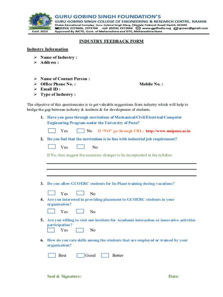 This questionnaire aims to gather valuable feedback from industries to help bridge the gap between industry and educational institutes, focusing on curriculum alignment and potential collaborations.