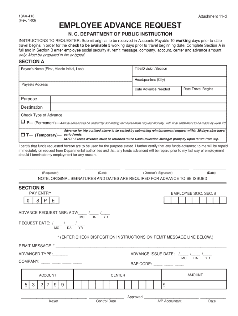 This document is used by employees of the North Carolina Department of Public Instruction to request an advance for travel-related expenses. It includes sections for providing personal information,