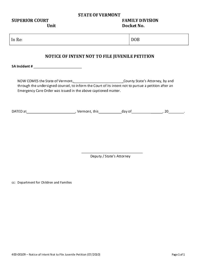 Get the free Notice of Intent Not to File Juvenile Petition
