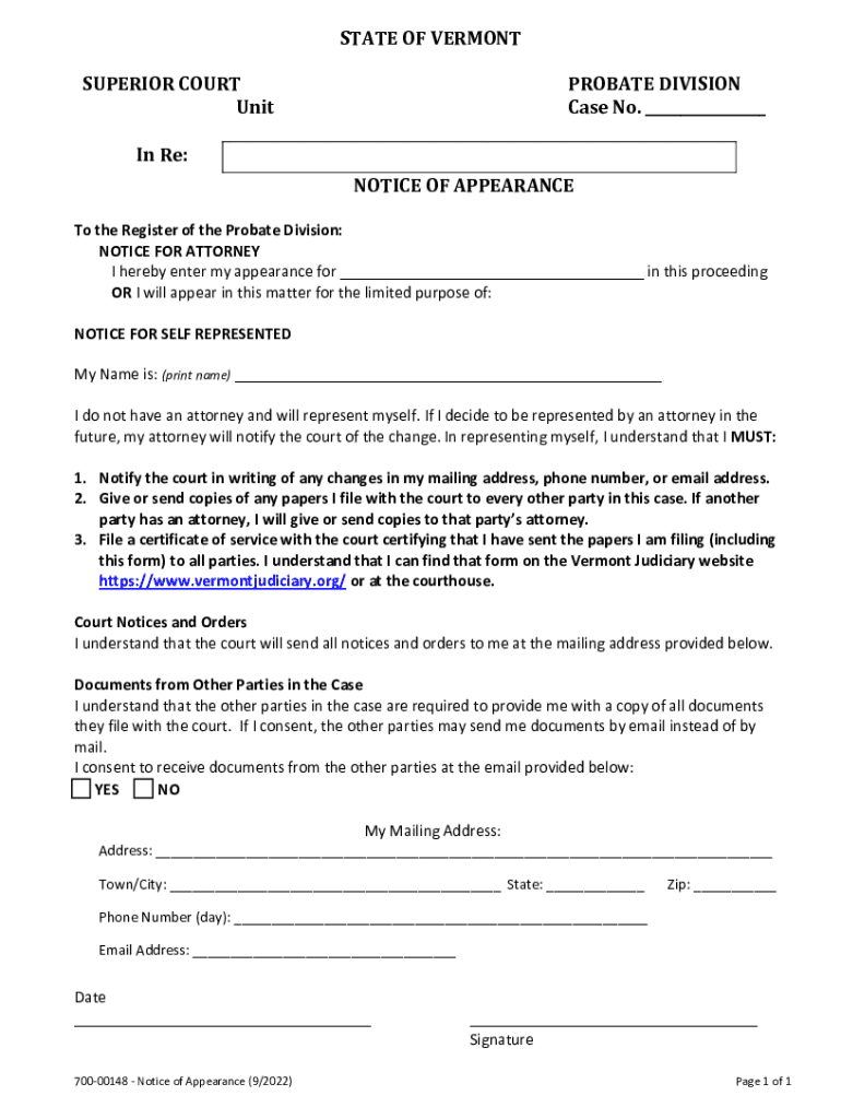 This document serves as a notice of appearance for an attorney or a self-represented individual in a probate case in the State of Vermont, outlining the responsibilities and notification procedures
