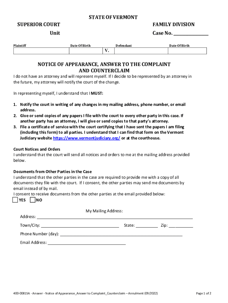 Este formulario permite a un demandado en un caso de anulación presentar su respuesta al comunicado del demandante y presentar una contrademanda. El demandado puede representarse a sí mismo y debe