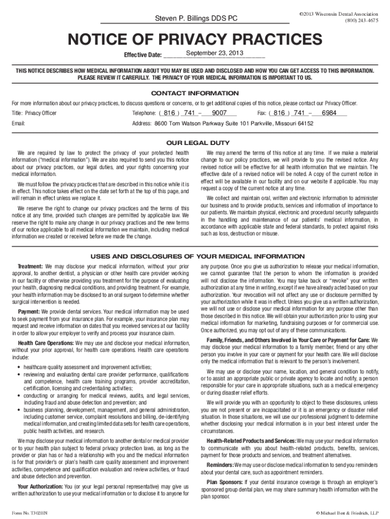 2013 Wisconsin Dental Association (800) 2434675Steven P. Billings DDS PCNOTICE OF PRIVACY PRACTICES September 23, 2013 Effective Date: ___ THIS NOTICE DESCRIBES HOW MEDICAL INFORMATION ABOUT YOU MAY