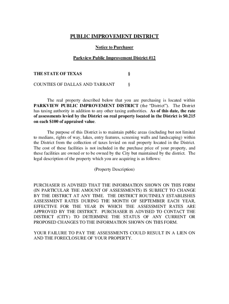 This document serves as a notice to purchasers regarding the Parkview Public Improvement District #12 in Texas, detailing the assessment rates levied on real property, the purpose and maintenance