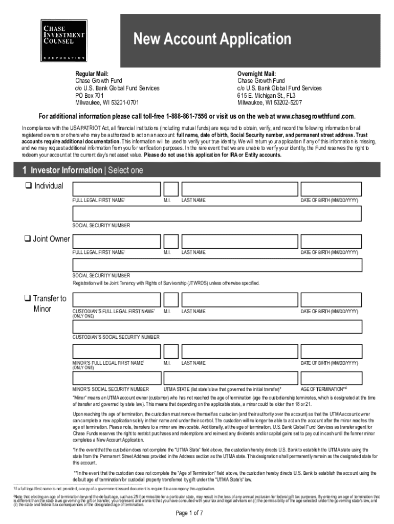 This document is an application form for opening a new account with the Chase Growth Fund, which includes providing personal information, investment choices, and compliance with the USA PATRIOT Act.
