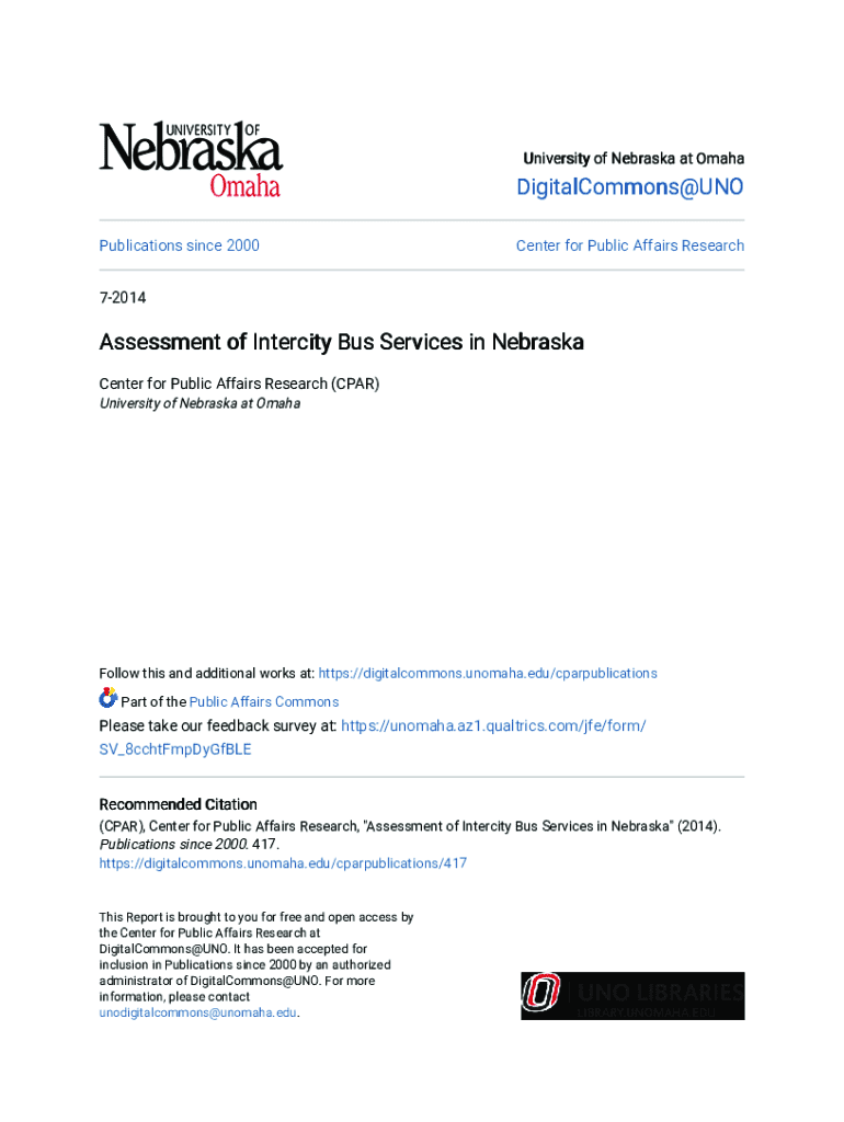 University of Nebraska at OmahaDigitalCommons@UNO Publications since 2000Center for Public Affairs Research72014Assessment of Intercity Bus Services in Nebraska Center for Public Affairs Research