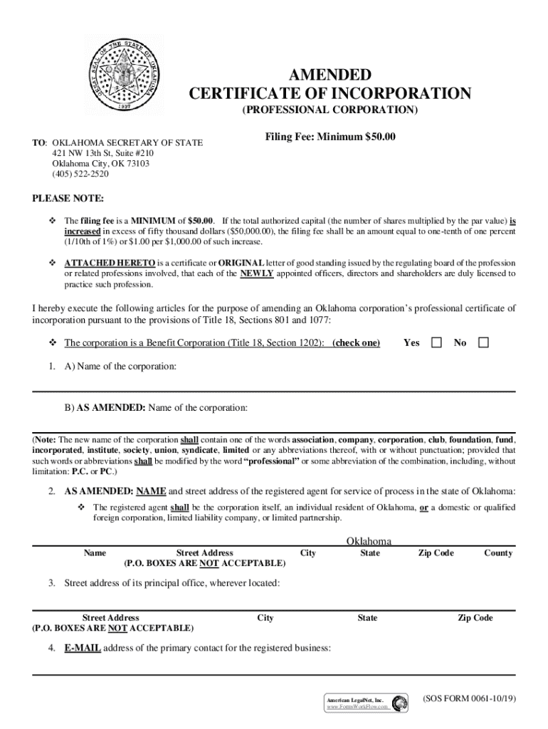 This document serves as an amendment to a professional corporation\'s certificate of incorporation in Oklahoma, detailing the changes including the corporation\'s name, registered agent, profession,
