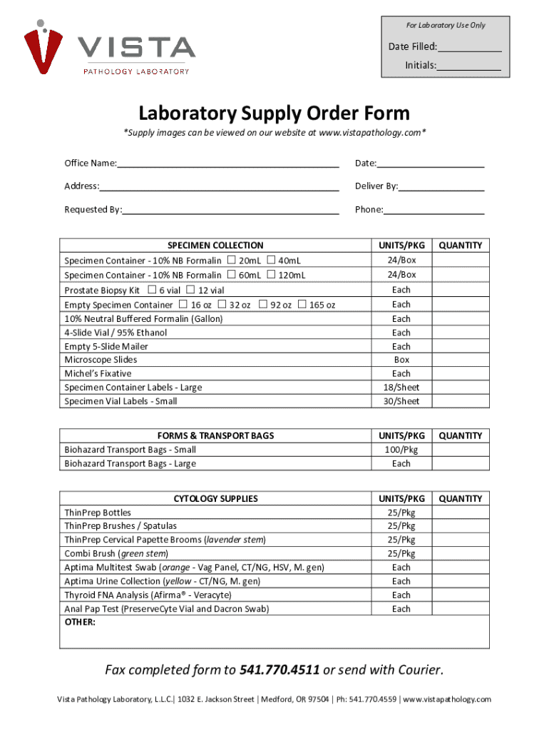 This form is intended for ordering laboratory supplies, including specimen collection containers and cytology supplies. It provides fields for filling in office details, delivery instructions, and