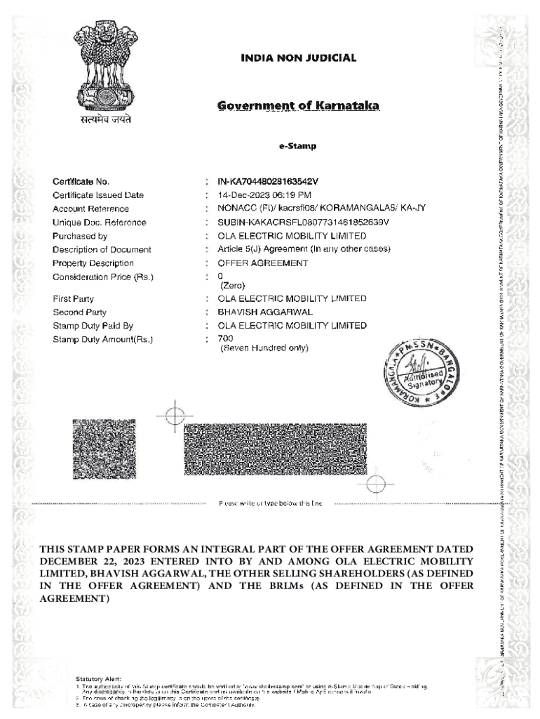 THIS STAMP PAPER FORMS AN INTEGRAL PART OF THE OFFER AGREEMENT DATED DECEMBER 22, 2023 ENTERED INTO BY AND AMONG OLA ELECTRIC MOBILITY LIMITED, BHAVISH AGGARWAL, THE OTHER SELLING SHAREHOLDERS (AS