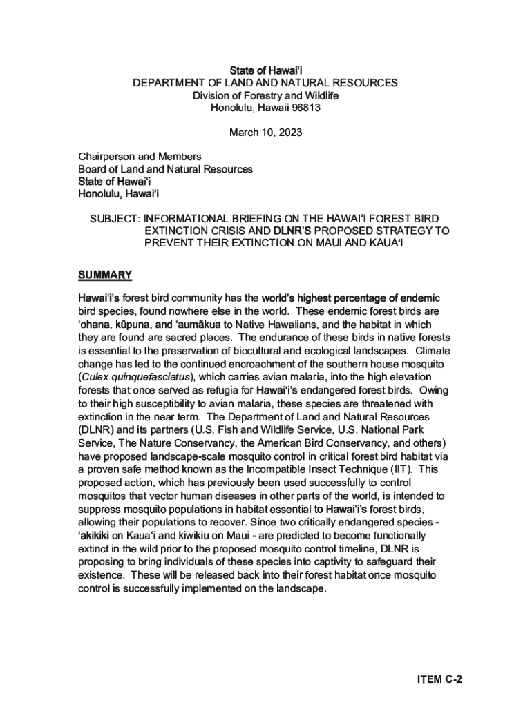 DEPARTMENT OF LAND AND NATURAL RESOURCES Division of Forestry and Wildlife Honolulu, Hawaii 96813 March 10, 2023 Chairperson and Members Board of Land and Natural ResourcesSUBJECT: INFORMATIONAL BRIEFING