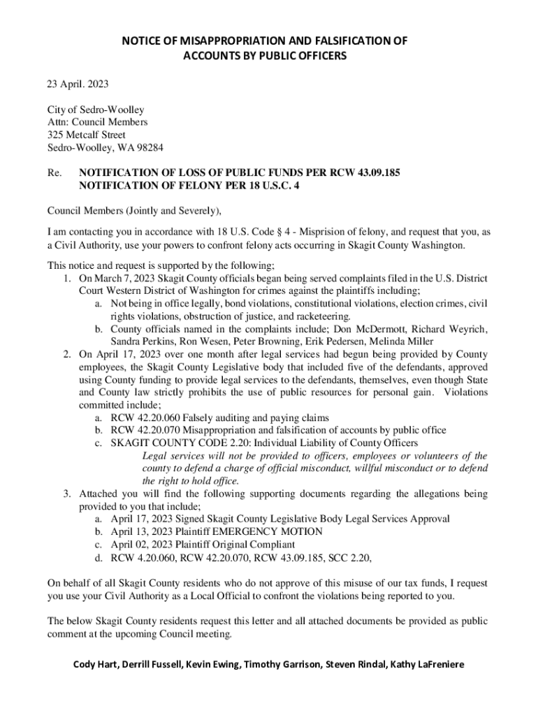 This document serves as a formal notification regarding the misappropriation and falsification of accounts by public officials in Skagit County, Washington. It outlines criminal allegations against
