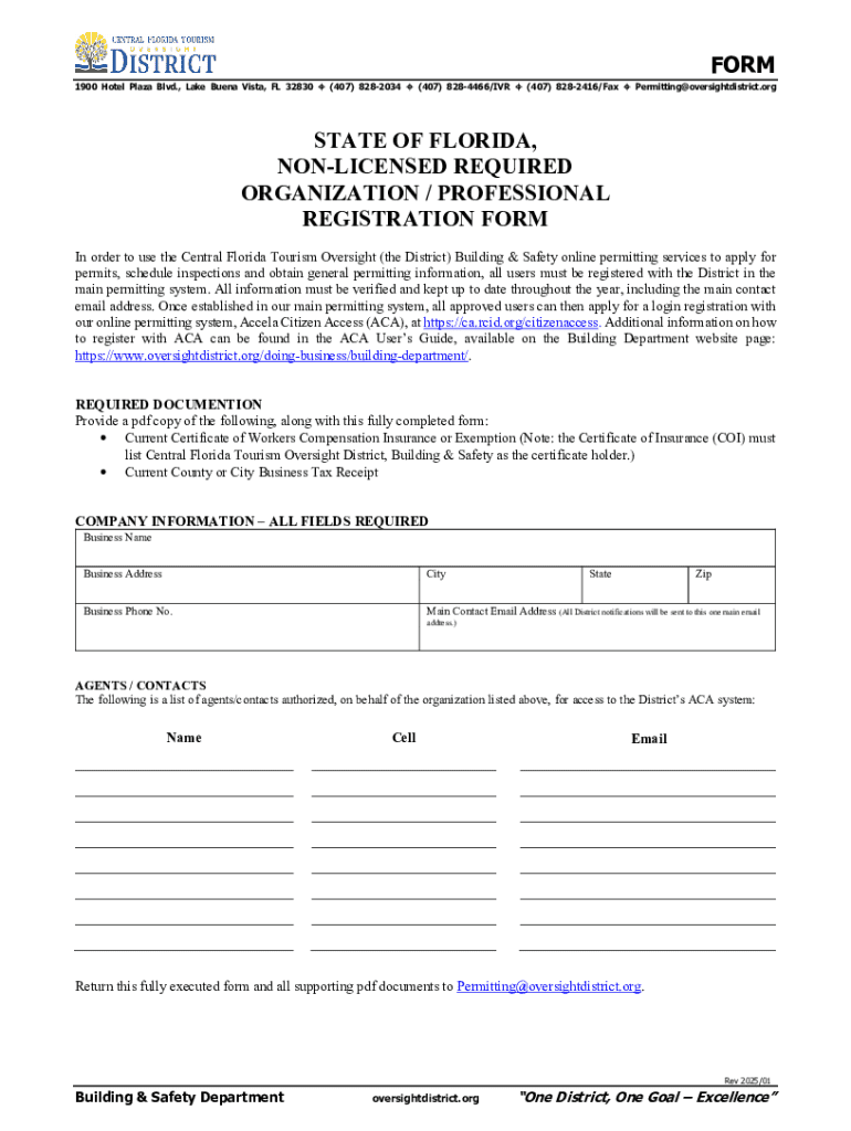 Este formulario es necesario para que las organizaciones no licenciadas se registren y utilicen los servicios de permisos de construcción y seguridad del Central Florida Tourism Oversight. Se requiere
