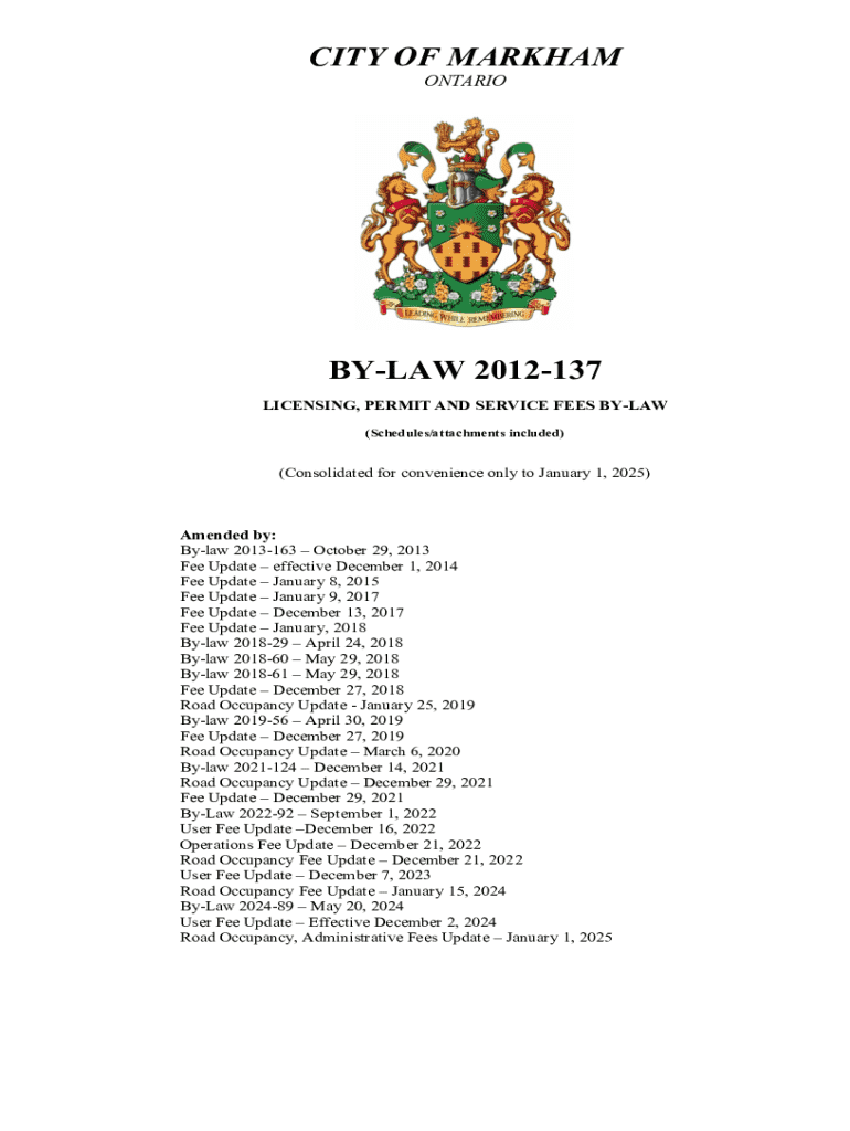Este by-law consolida las tarifas de licencias, permisos y servicios del municipio en un solo documento, estableciendo diversos cargos y regulaciones aplicables en la ciudad de Markham. Incluye actualizaciones