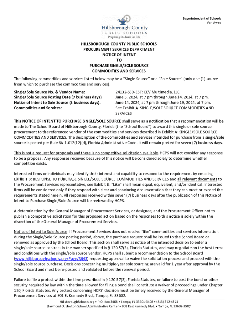 Este documento notifica la intención de adquirir productos y servicios de una sola fuente del proveedor CEV Multimedia, LLC, específicamente para el currículo digital utilizado por los maestros