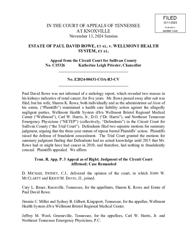IN THE COURT OF APPEALS OF TENNESSEE AT KNOXVILLE12/11/2024November 13, 2024 Session ESTATE OF PAUL DAVID ROWE, ET AL. v. WELLMONT HEALTH SYSTEM, ET AL. Appeal from the Circuit Court for Sullivan